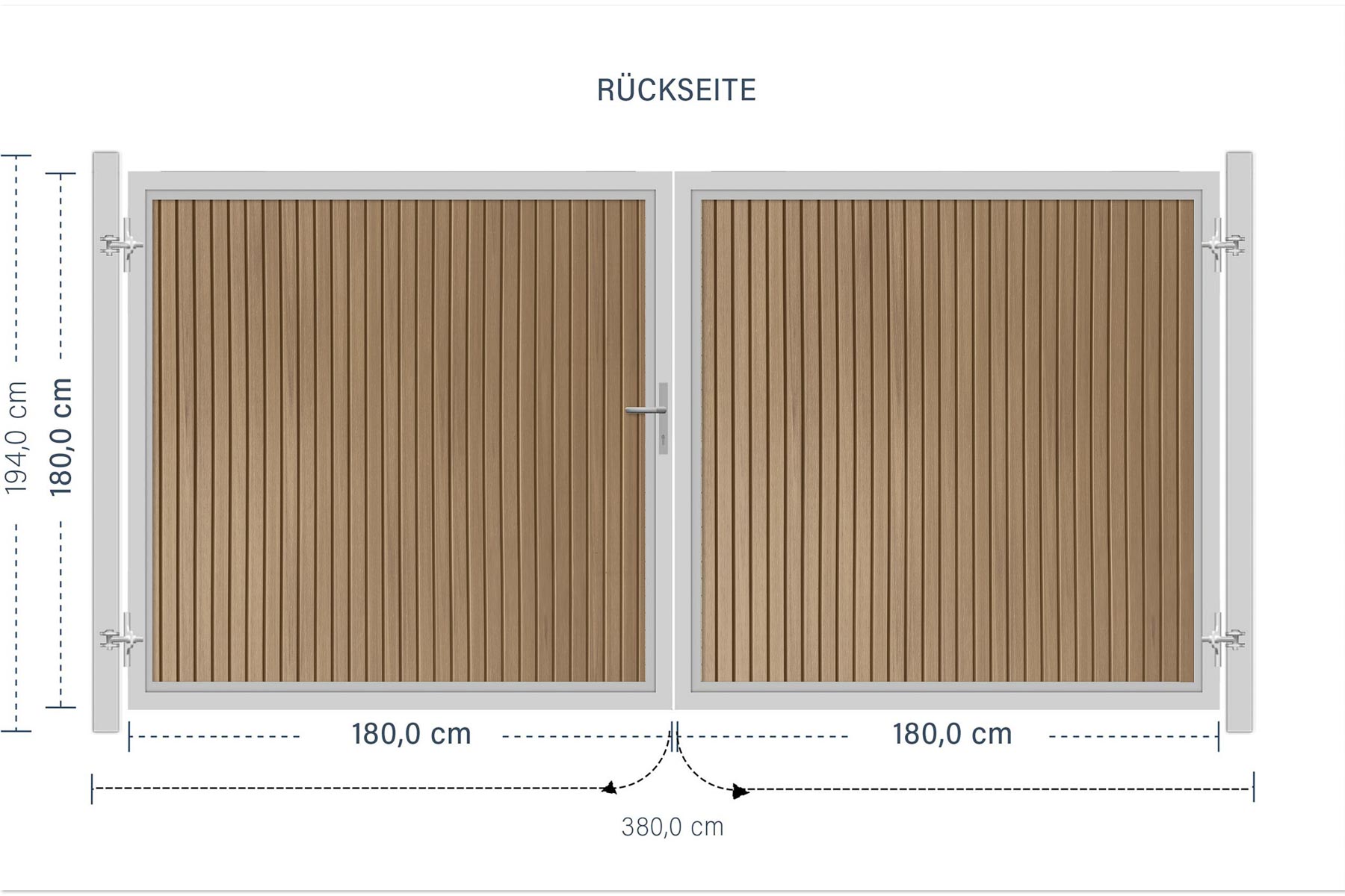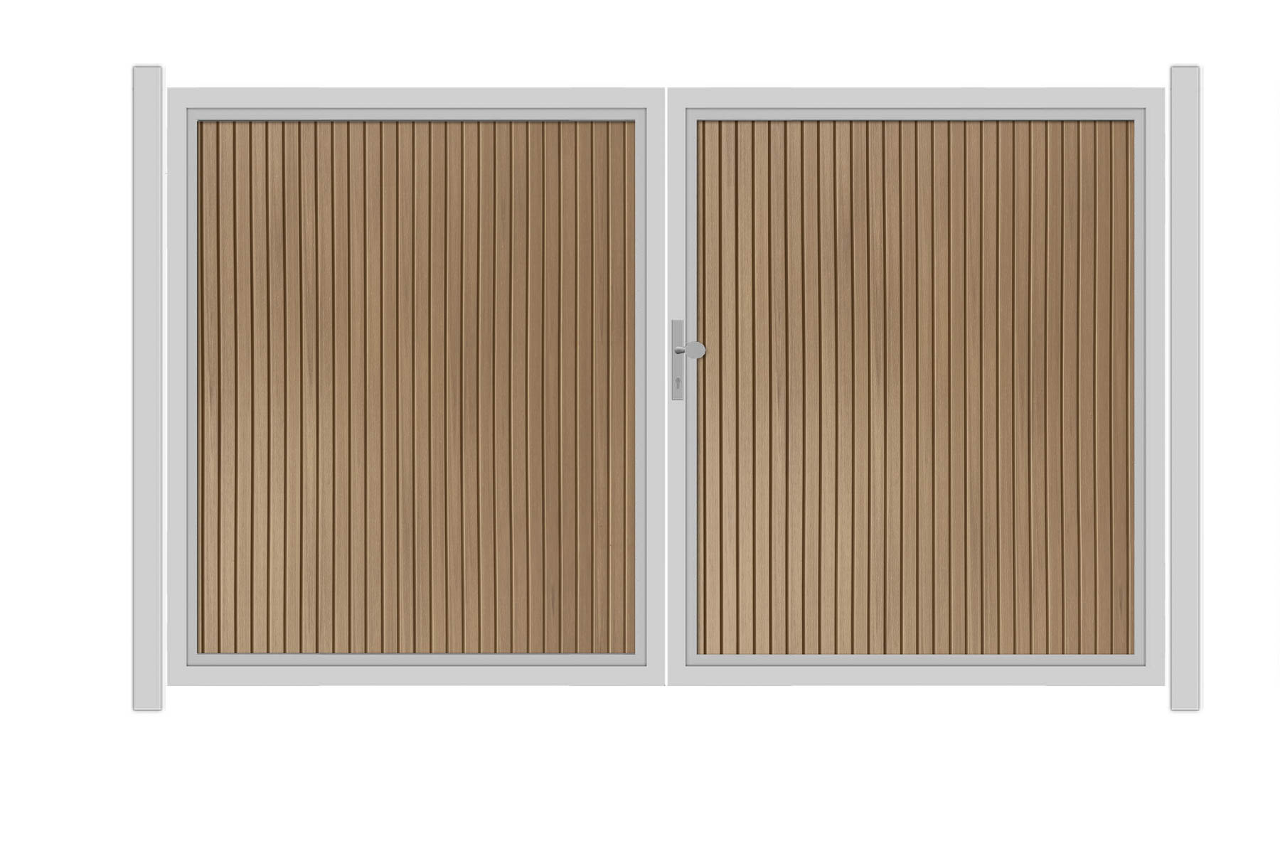 Das SYSTEM NEO Platinum Doppeltor-Set in Lärche mit einer Breite von 3600 mm und einer Höhe von 1800 mm bietet eine hochwertige und stabile Torlösung für Ihre Sichtschutzanlage. Ein umlaufender Doppelrahmen aus pulverbeschichtetem Edelstahl und eloxiertem Aluminium fasst die WPC Profile ein. Die Profile sind in senkrechter Ausrichtung verbaut. Der optional erhältliche Profilzylinder (Art.2550) ist separat bestellbar.