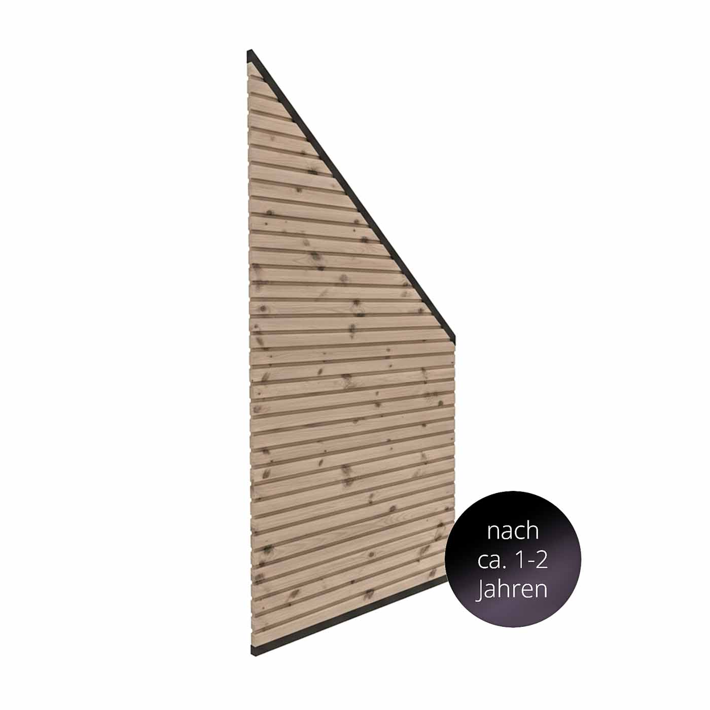 Die skandinavische Kiefer mit ihren charakteristischen Ästen wird für den Einsatz im Außenbereich bei der thermischen Behandlung mit ca. 190 °C komplett thermisch behandelt. Hierdurch erhöht sich die biologische Widerstandsfähigkeit des Holzes und damit die Dauerhaftigkeit des Holzes im Freien. Die besondere Ausdruckskraft des warmen Brauntons unterstreicht das natürliche Farbspiel von Splint- und Kernholz. Das durchgefärbte Thermoholz ist grundsätzlich wartungsarm. Der natürliche Vergrauungsprozess durch das UV-Licht beginnt direkt nach der Montage und verleiht den Elementen ein edles silberfarbenes Design. Abhängig von der Bewitterungsintensität (UV-Bestrahlung/Niederschlag) wird der graue Farbton nach etwa 1 - 2 Jahreszyklen erreicht.