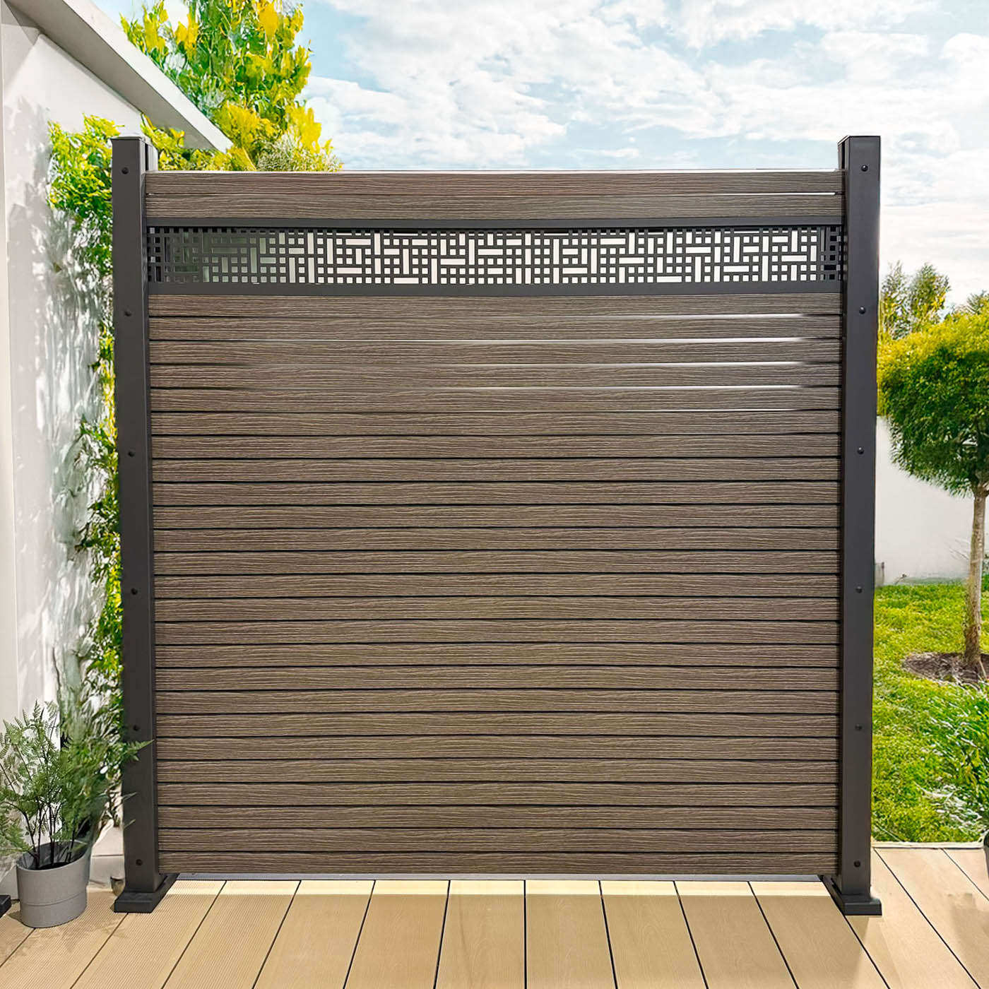 Im Projekt 02 hat sich der Kunde dafür entschieden, den Rhombus Zaun in der Optik Vintage Oak durch den Einsatz von Dekorprofilen in der Ausführung „Quattro“ aufzuwerten und ihm eine besondere gestalterische Note zu verleihen. Zur Befestigung im Boden wurden quadratische Klemmpfosten verwendet.