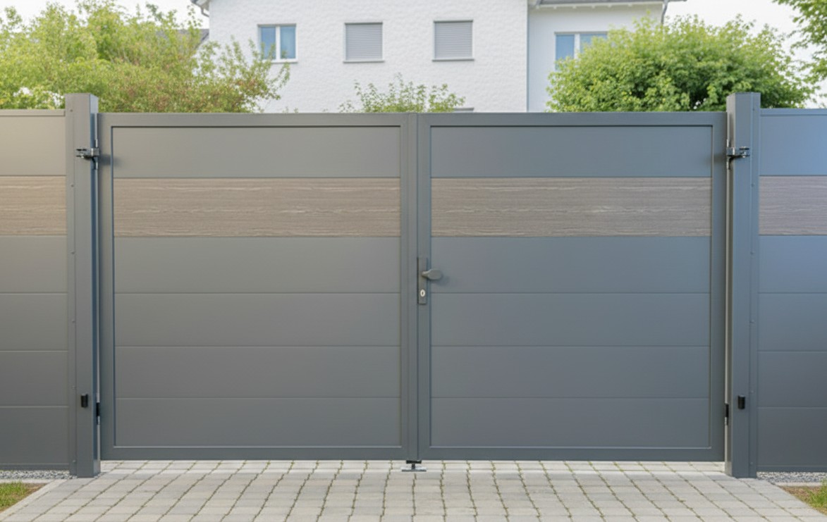 Entdecken Sie unsere Doppeltor Anlagen für das Zaunsystem Alu Plus und Alu XL. Wahlweise mit oder ohne elektrischen Antrieb erhältlich.