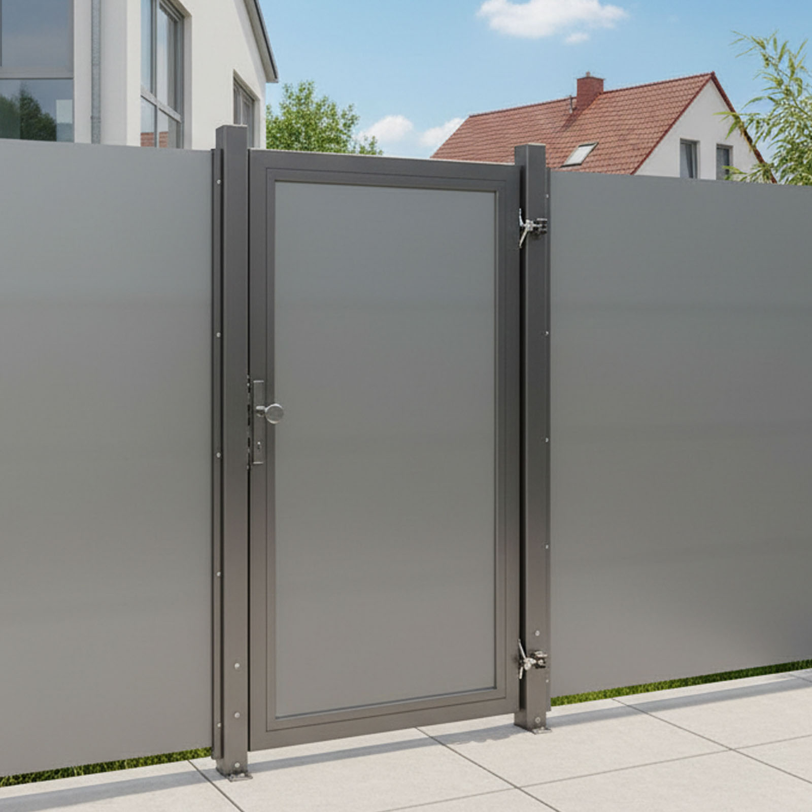 Das SYSTEM BOARD Tor-Set in der Farbe Titangrau mit einer Breite von 1250 mm und einer Höhe von 1800 mm ist die ideale Ergänzung zu Ihrer Board-Zaunanlage. Der stabile Aluminiumrahmen mit verstärkenden Stahlwinkeln sorgt für eine hohe Standfestigkeit