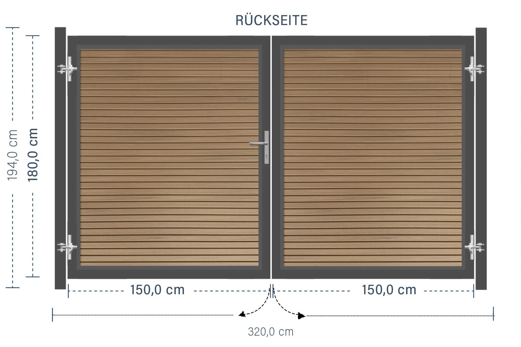 Das SYSTEM NEO Platinum Doppeltor-Set in Lärche mit einer Breite von 3000 mm und einer Höhe von 1800 mm bietet eine hochwertige und stabile Torlösung für Ihre Sichtschutzanlage. Ein umlaufender Doppelrahmen aus pulverbeschichtetem Edelstahl und eloxiertem Aluminium fasst die WPC Profile ein. Der optional erhältliche Profilzylinder (Art.2550) ist separat bestellbar.