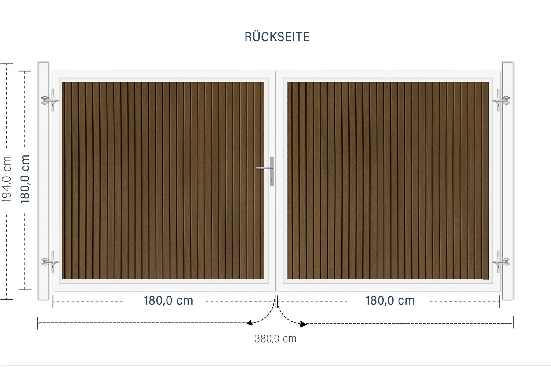 Das SYSTEM NEO Platinum Doppeltor-Set in Teak Braun mit einer Breite von 3600 mm und einer Höhe von 1800 mm bietet eine hochwertige und stabile Torlösung für Ihre Sichtschutzanlage. Ein umlaufender Doppelrahmen aus pulverbeschichtetem Edelstahl und eloxiertem Aluminium fasst die WPC Profile ein. Die Profile sind in senkrechter Ausrichtung verbaut. Der optional erhältliche Profilzylinder (Art.2550) ist separat bestellbar.