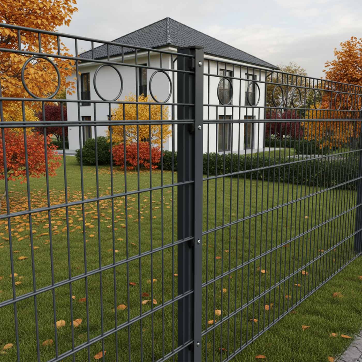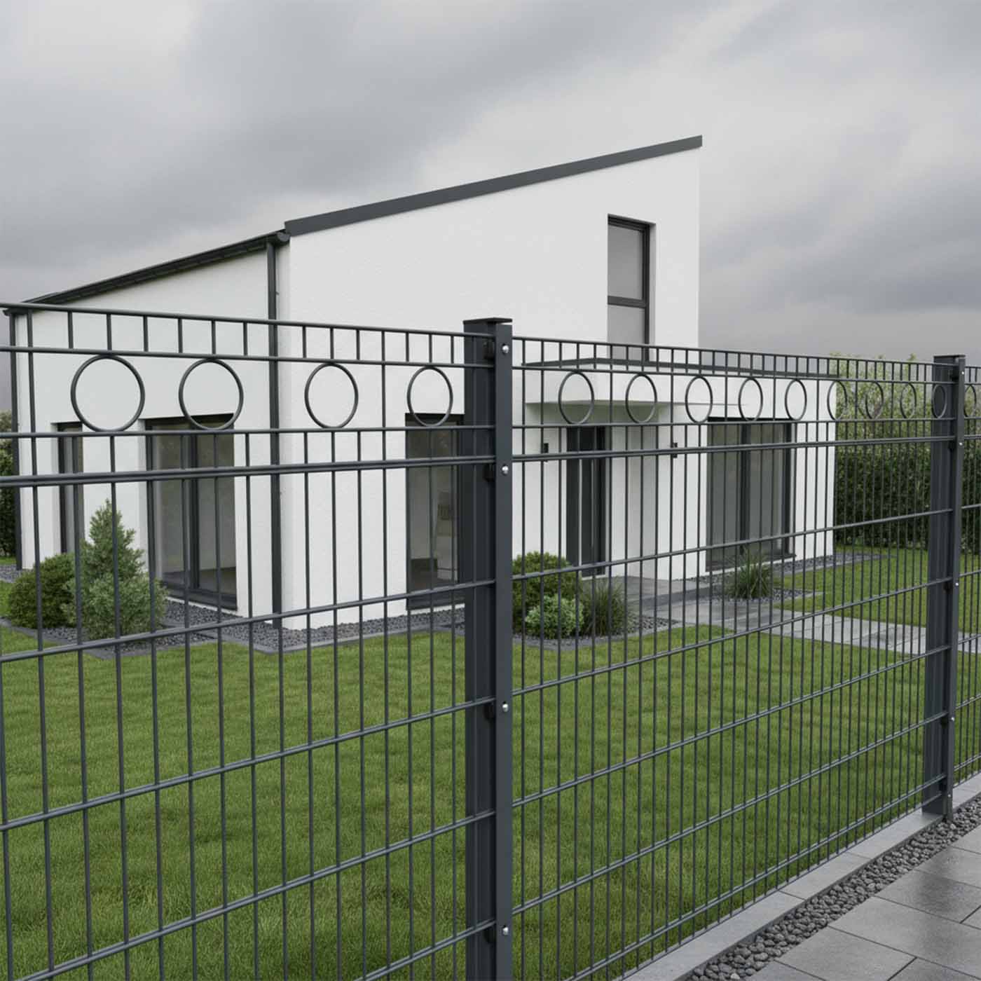 Unsere Schmuckzäune vereinen Funktionalität mit elegantem Design und setzen stilvolle Akzente in jedem Außenbereich. Wählen Sie aus den dekorativen Mustern Raute, Kreis und Bogen. Im Gegensatz zur klassischen Doppelstabmatte überzeugt der Schmuckzaun mit einer individuellen und ansprechenden Optik, ohne dabei auf Stabilität und Sicherheit zu verzichten. Hochwertige Materialien und eine präzise Verarbeitung garantieren Langlebigkeit sowie Witterungsbeständigkeit