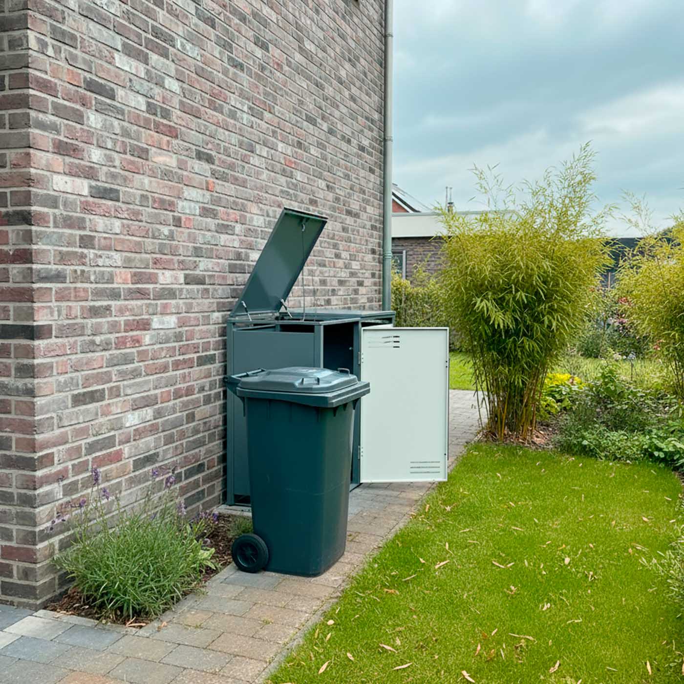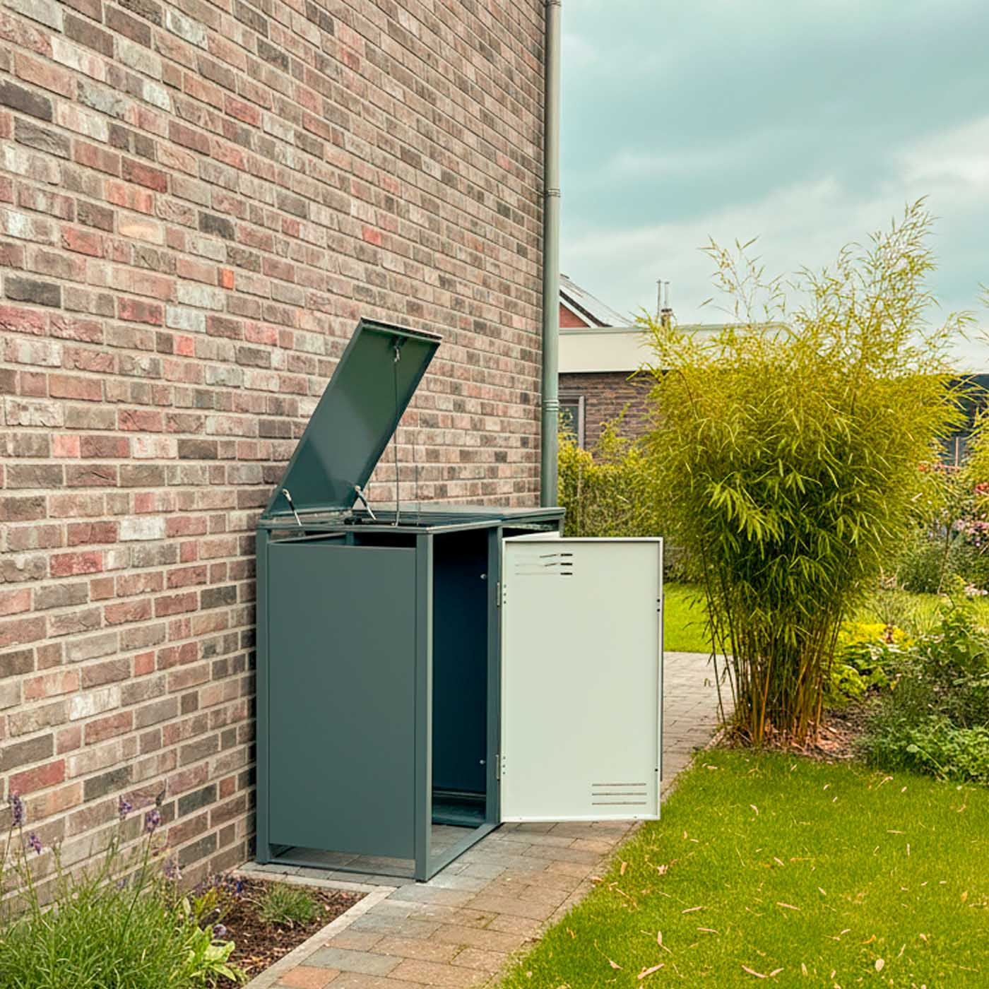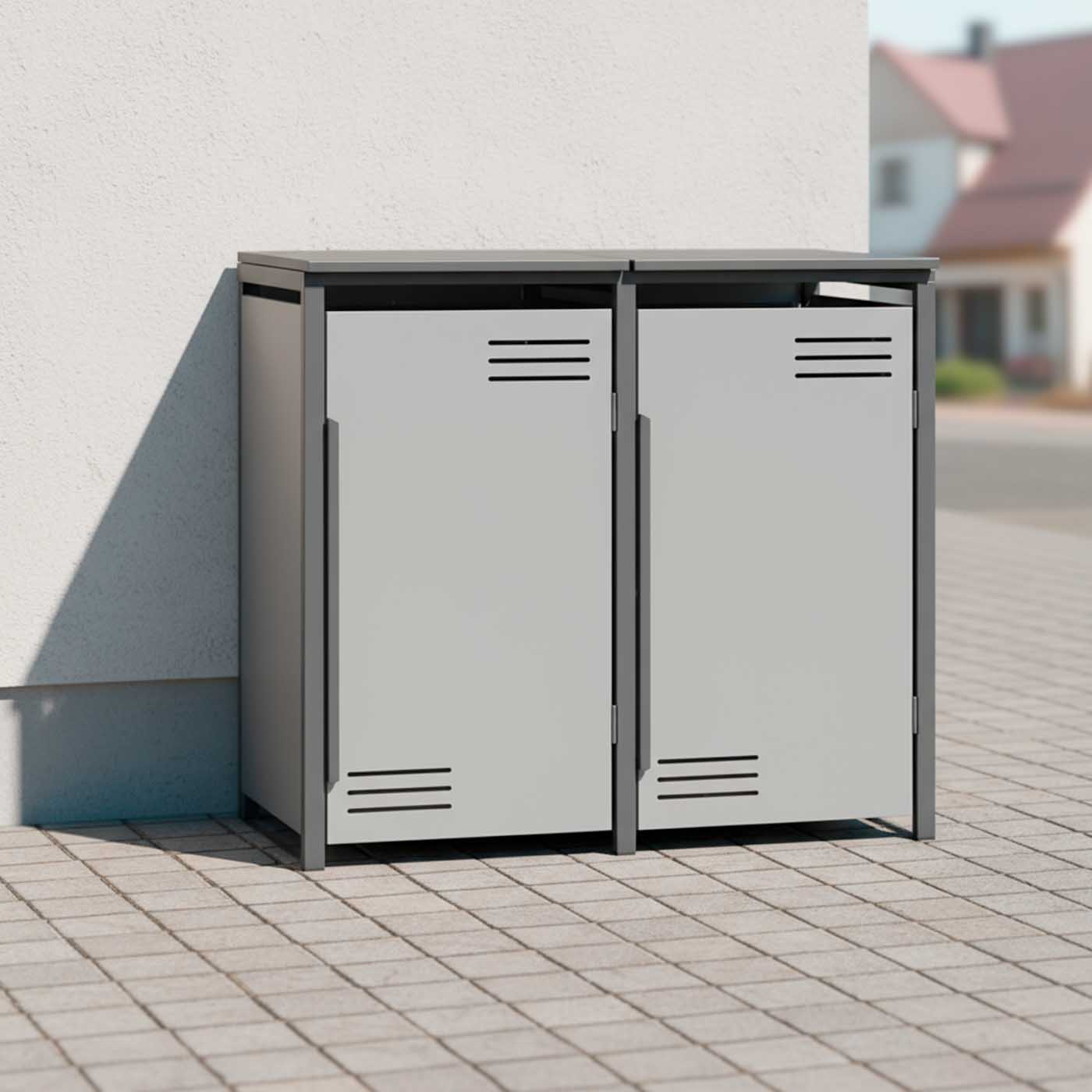 Unsere Mülltonnenbox lässt Ihre Mülltonnen auf elegante Art und Weise verschwinden und sorgt für eine tolle Optik rund um Ihr Haus. Verstauen Sie Ihre 120 L. und 240 L. Mülltonnen und sorgen so für einen einheitlichen Look. Die praktische Einhand-Bedienung ermöglicht das kinderleichte Befüllen der Mülltonnenbehälter, ohne den Müllbeutel aus der Hand legen zu müssen. Der komfortable Soft-Close-Deckel mit Gasdruckdämpfern ermöglicht ein müheloses und geräuschloses Öffnen und Schließen. Die Magnetverschlüsse an den Türen sorgen auch bei Wind für einen festen Halt der Türen. Verzinkte und beschichtete Stahlteile halten den täglichen Belastungen locker stand und schützen Ihre Mülltonnen vor Fremdzugriff und Witterung. Hochwertige Edelstahl-Scharniere garantieren eine lange Lebensdauer der Mülltonnenboxen.