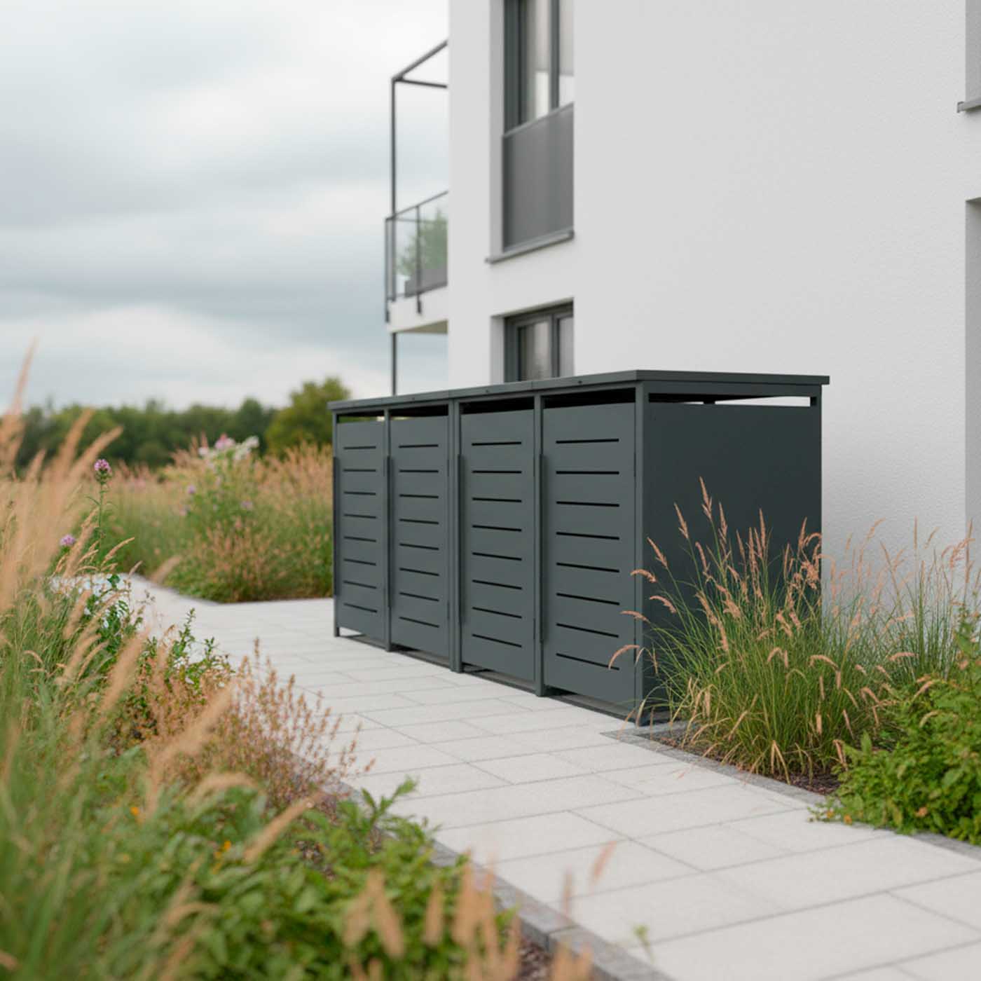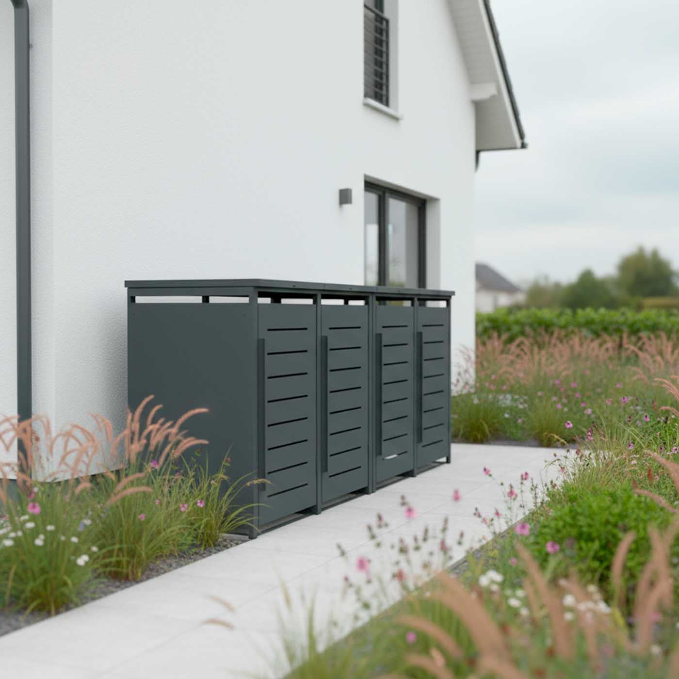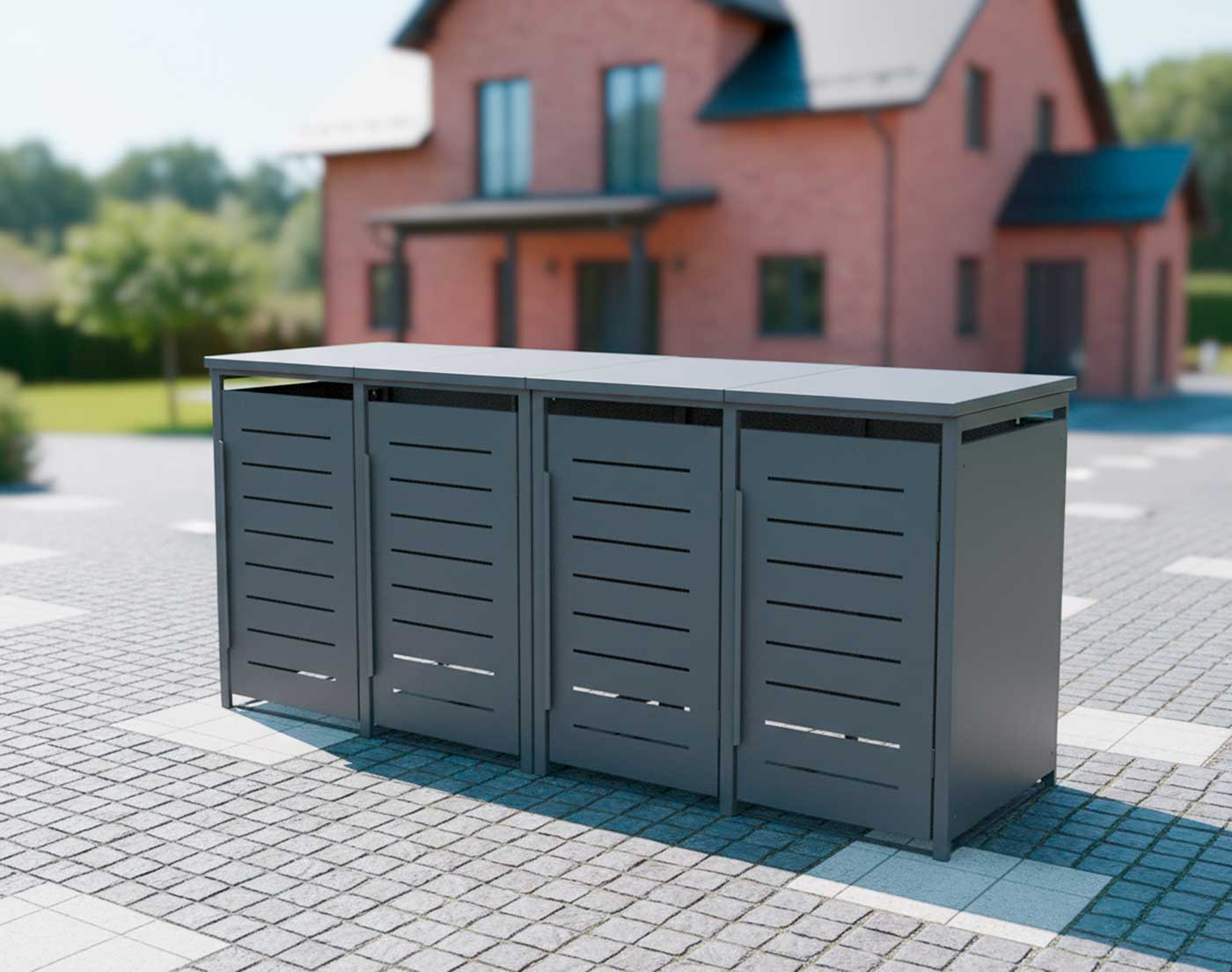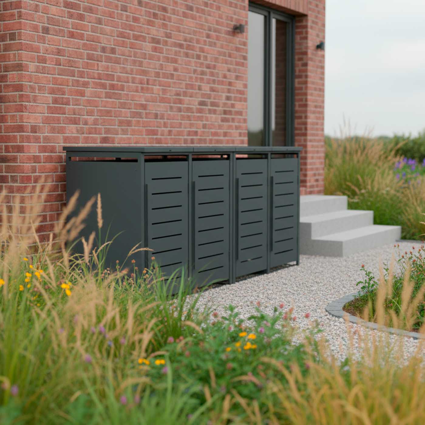 Unsere Mülltonnenbox lässt Ihre Mülltonnen auf elegante Art und Weise verschwinden und sorgt für eine tolle Optik rund um Ihr Haus. Verstauen Sie Ihre 120 L. und 240 L. Mülltonnen und sorgen so für einen einheitlichen Look. Die praktische Einhand-Bedienung ermöglicht das kinderleichte Befüllen der Mülltonnenbehälter, ohne den Müllbeutel aus der Hand legen zu müssen. Der komfortable Soft-Close-Deckel mit Gasdruckdämpfern ermöglicht ein müheloses und geräuschloses Öffnen und Schließen. Die Magnetverschlüsse an den Türen sorgen auch bei Wind für einen festen Halt der Türen. Verzinkte und beschichtete Stahlteile halten den täglichen Belastungen locker stand und schützen Ihre Mülltonnen vor Fremdzugriff und Witterung. Hochwertige Edelstahl-Scharniere garantieren eine lange Lebensdauer der Mülltonnenboxen.